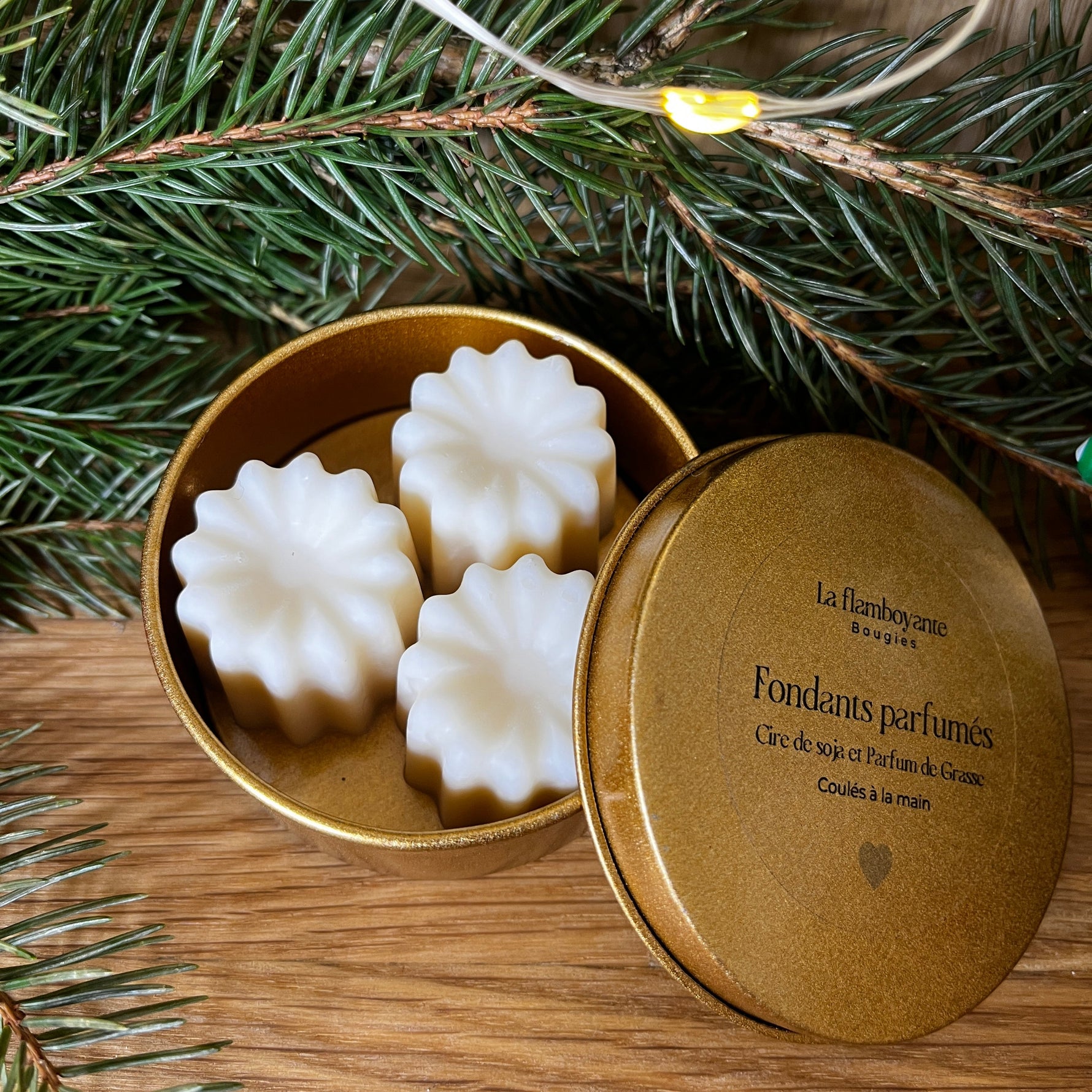 Coulés à la main en cire végétale et parfumés avec des fragrances de Grasse, ces fondants se déposent simplement dans votre brûle-parfum pour diffuser une odeur délicieuse et réconfortante dans toute la pièce.